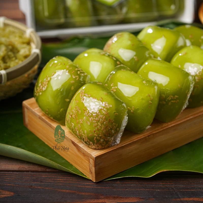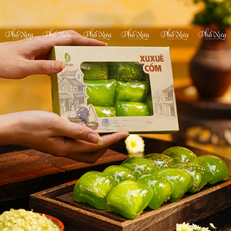 Bánh xu xuê cốm xào được làm từ lớp vỏ bột sắn trong veo, mềm mát, bao bọc phần nhân cốm non xào dừa thơm dẻo, ngọt thanh tự nhiên. Bên ngoài rắc thêm chút vừng rang, tạo điểm nhấn bùi thơm hài hòa. Mỗi chiếc bánh là sự kết hợp mộc mạc mà tinh tế, gợi nhớ hương vị tuổi thơ Hà Nội – rất thích hợp làm quà tặng dịp lễ, tết hoặc đơn giản là một món chiều lòng người thương.